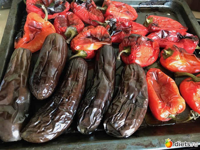 Почистила и пожарила часть баклажанов с перцем. Остальную часть перца разделила: одну часть порезала и заморозила, другую запекла с оставшимися баклажанами.