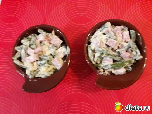 Ветчину режем кубиками. Смешиваем в миске фасоль, ветчину, натертый сыр, столовую ложку сметаны.