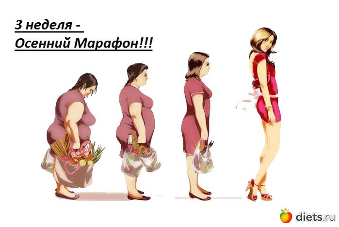 Доброго времени суток, уважаемые марафонцы! Принимайте задания третьей недели! Срок выполнения - до следующего взвешивания, т. е. на будущей неделе - до 22 сентября включительно. Всем участвующим в выполнении:+ 1000 к карме (а пусть будет))). Задания поделены на 5 блоков: * спорт * питание * психология * красота * для души Выполнение заданий добровольное...