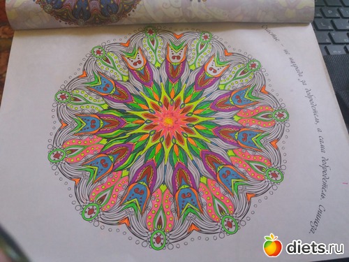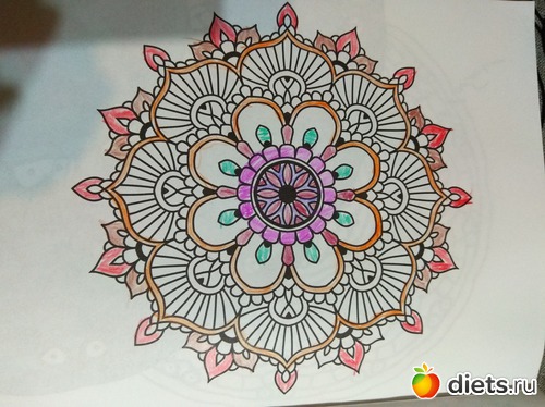 Вот за этот пункт хочется сказать отдельное спасибо. Спасибо, что напомнили. А то у меня два альбома лежат без дела. И самое важное, что мандала реально работает и помогает. Мне по крайней мере. Зв эту неделю, что я ее красила ни разу не сорвалась на повышение голоса, реагировала на все сииуации спокойно и с улыбкой. А еще вместе со мной стал разукрашивать пятилетний сын. Просто садился и мог минут 20-30 рисовать.