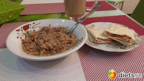 З.каша гречневая+лаваш с творожным сыром и помидоркой(съела один кусочек)+кофемолоко