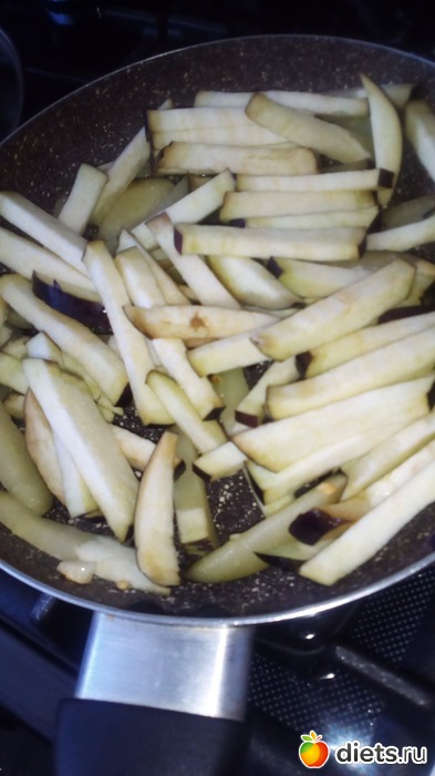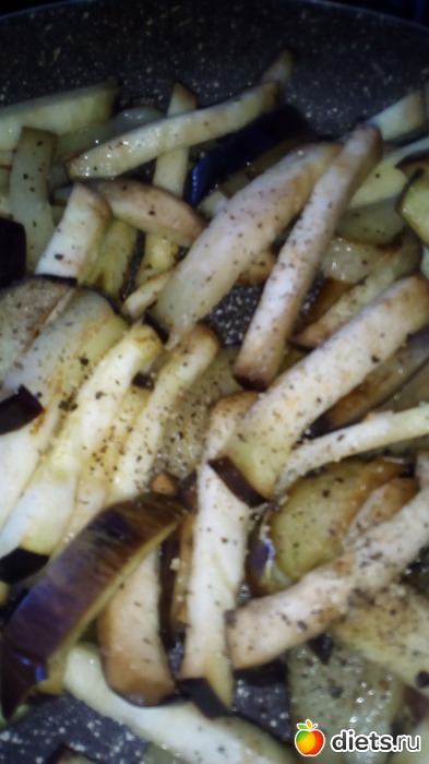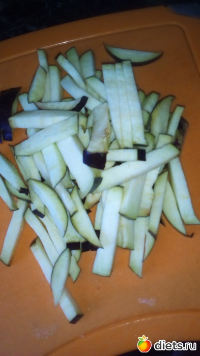 Баклажаны моем и нарезаем небольшими брусочками. Солим и перемешиваем.