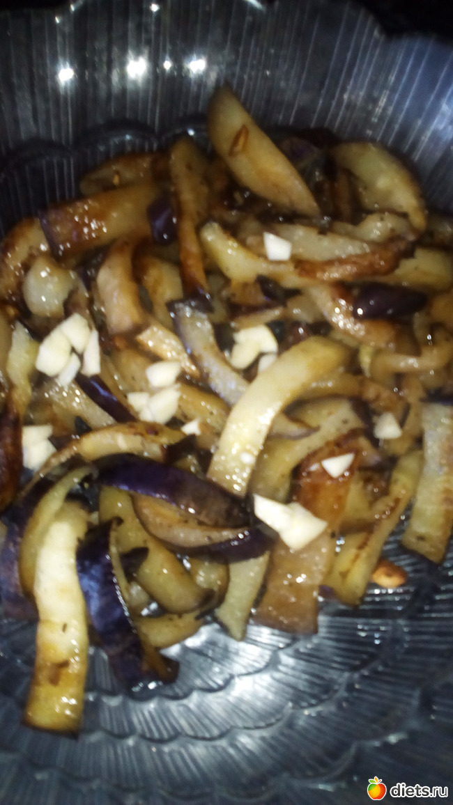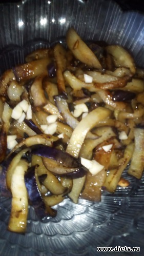 Хорошо разогреваем сковороду с растительным маслом, выкладываем половину нарезанного чеснока и слегка обжариваем. Чеснок можно удалить, масло приобретет запах чесночка. Добавляем баклажаны, перемешиваем и обжариваем, приблизительно 10 мин. Добавляем соевый соус с сахаром, перемешиваем и жарим еще минут 5 до мягкого состояния баклажан. Долго жарить не надо, станут очень мягкими и не будут держать форму. Снимаем с огня и добавляем оставшийся чеснок. Перекладываем в тарелку и можно подавать к столу.