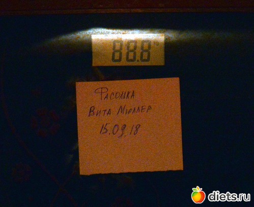 Отвес по плану - 500 г. На фото видно 88,5 кг, отнимаем 500 г (столько весит фотоаппарат). Прошу прощения за качество фото: батарея почти села, фокусирует плохо.