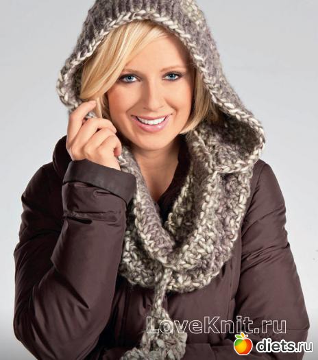 Удивительная модель шарфа-хомута с капюшоном и с помпонами сочетает в себе стиль и удобство.