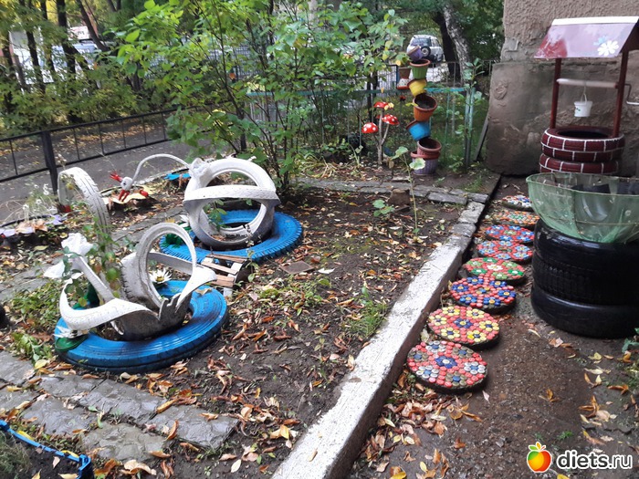 Это вот другой полисадничек. С лебедями из шин и разноцветной дорожкой из пробок. Там вон ещё колодец и цветочное кашпо.