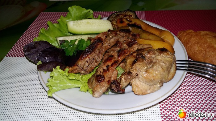 О.вчерашний шашлычок+зелень и овощи, кусочек хлебушка. Шашлык не доела.