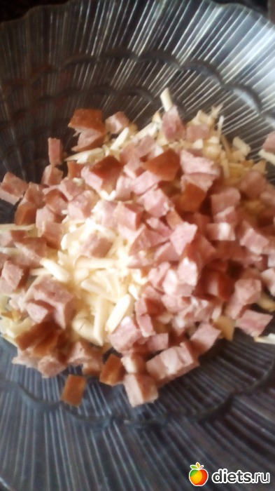 100 г ветчины(мяса) нарезаем небольшими кубиками.