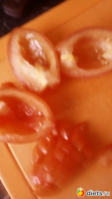 150 г свежих помидоров моем и разрезаем на 4 части. У каждой дольки помидоров вырезаем серединку с семенами, чтобы в салат не стекала лишняя жидкость. Оставшуюся мякоть нарезаем небольшими кубиками.