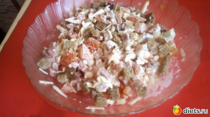 Перед самой подачей в салат добавляем сухарики и опять немного перемешиваем.