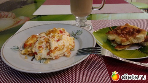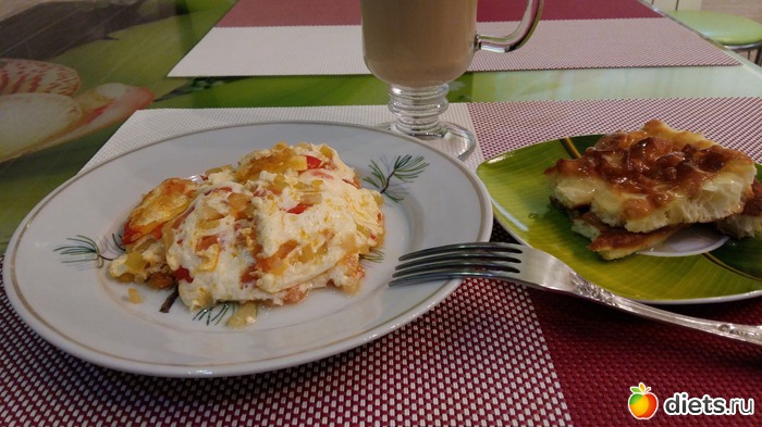 З.омлет с овощам+пара кусочков пышки +чайная ложечка меда+кофемолоко