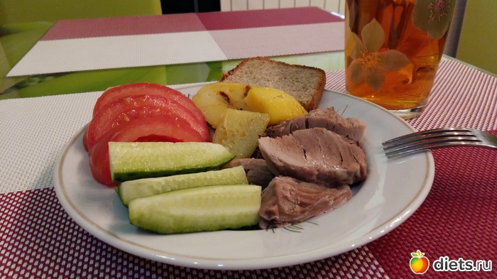 О.мясо запеченной рульки+картошечка+огурчик и помидорчик+хлеб+чай с лимоном