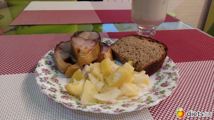 У.поэтому мой ужин состоял из картофельного салата+скумбрии и хлеба, все вместе 220 грамм(не могу рыбу без хлеба есть)+молокочай. Еще съела половинку груши(за кадром)