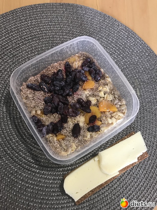 Ленивая овсянка с курагой, чиа, жимолостью. Хлебец с сыром. чай.