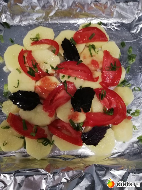 На фольге немного картошечки, помидор, базилик