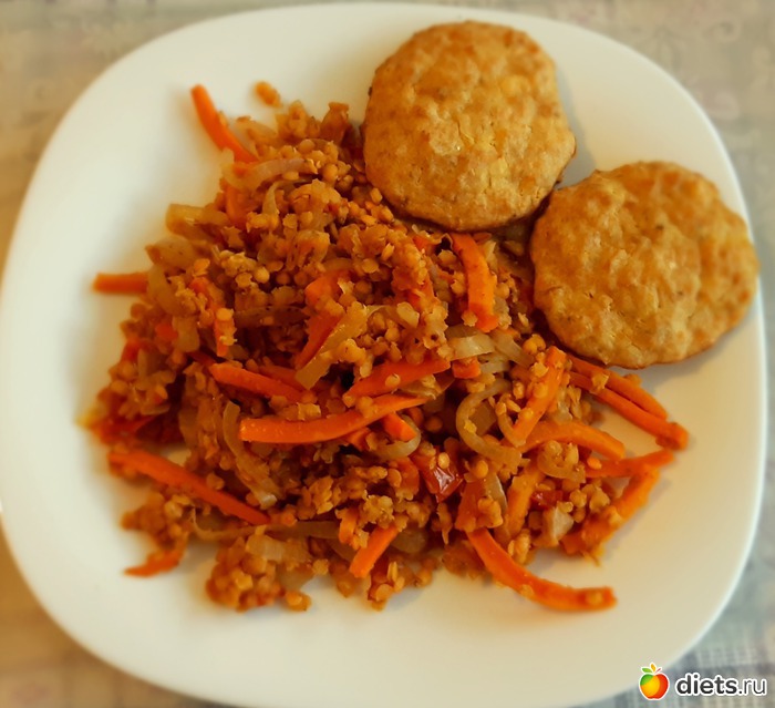 Лук, морковку, помидорку обжарила, потом чечевицу сырую закинула и водички немножко. Всё. Готовится красная быстро.