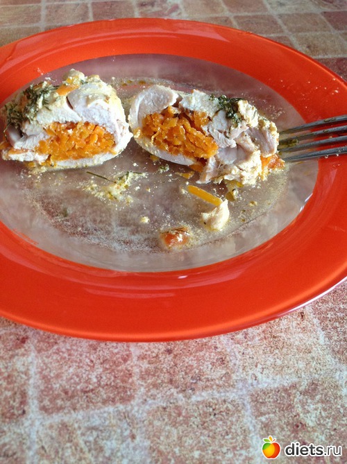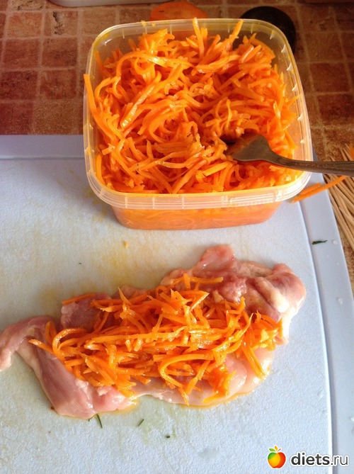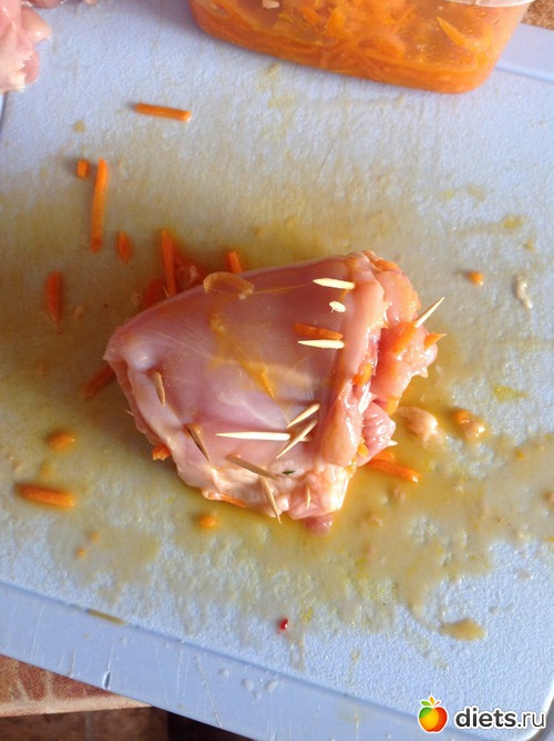 Второе блюдо- куриное бедро начиняла морковкой, корейской, тоже суперски получилось, даже в разрезе щелкнула))))