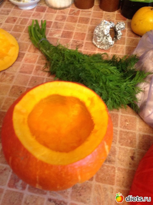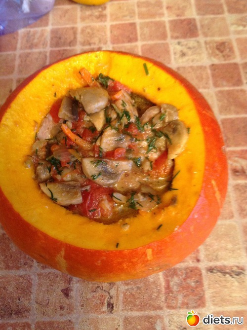 Делала рис, вырезку морковку, зелень, грибы, все только полезное , делала в тыкве,