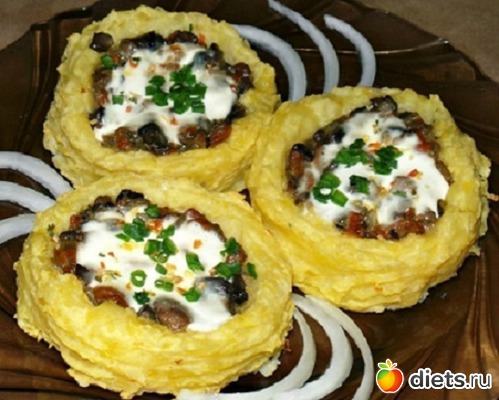 Выкладываем готовое картофельное пюре так, чтобы получились «гнёзда» — то есть с глубокой выемкой в середине.