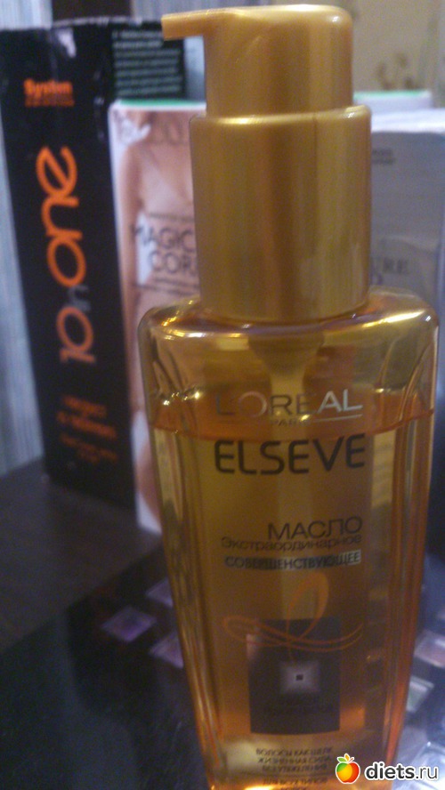 После мытья волосы трудно расчесать. Я использую масло на кончики и чуть выше. И волосы от этого совсем не промасленные, а блестящие и послушные. Перед плойкой, или вообще перед выходом на улицу, использую средство на фото на заднем плане. Пшыкаю на ладони, растираю и провожу по волосам. Волосы гладкие и ухоженные без кератина. Средство 10 ONE SISTEM.