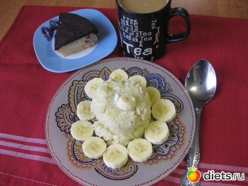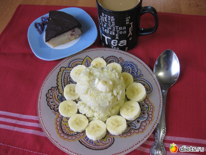 каша пшенная с бананом, запеканка творожная с брусникой, политая шоколадом 70%, кофе с молоком