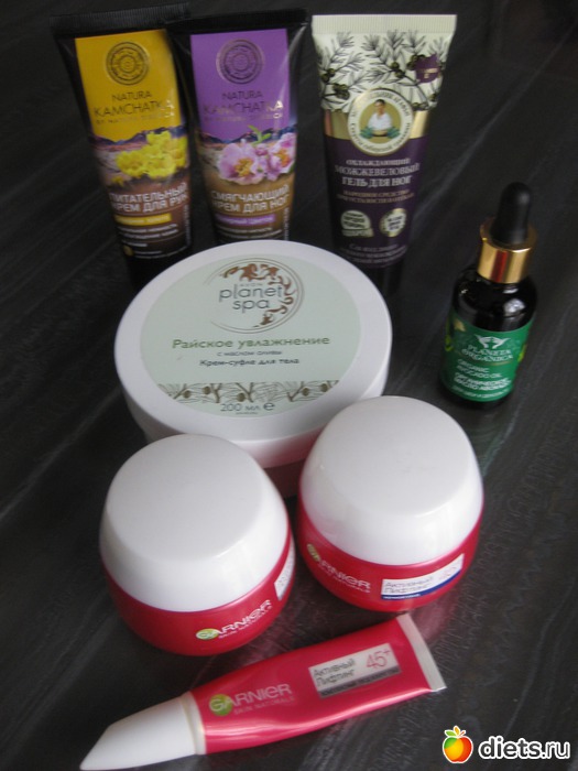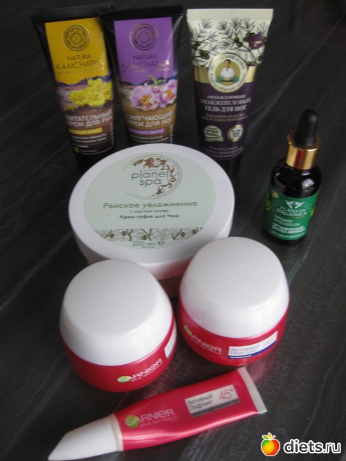 крема для рук, ног, - всегда разные, а вот уже полюбившаяся серия 45+ от Гарнье, уход за лицом ночь/день и уход за кожей вокруг глаз, - пользуюсь второй год, очень нравится! Крем-суфле для тела с оливковым маслом от Эйвон, - обожаю всю эту линейку, - скраб такой же для тела, маска д/волос и крем д/рук! Ну и масло авокадо для зоны шеи и декольте, тоже хорошая штука!