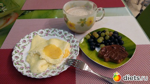 Завтрак : омлет с сыром, виноград заменяешь любым овощем или двумя. Шоколадное масло никуда не пристроишься, не в этот день.
