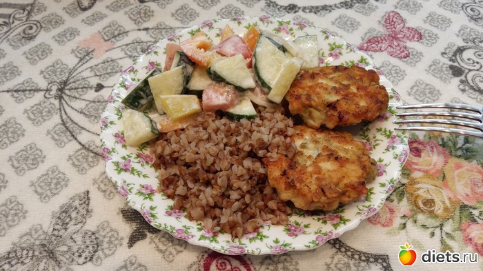 Обед : котлеты без гречки с салатом. И супчик овощной можно на первое.