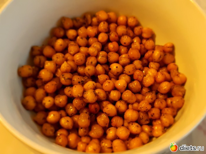 Нут на ночь замочить. Потом отварить. Посыпать любимыми специями, солькой и на противень в духовку. Жарить около 30 мин. при 160 градусах с конвекцией. Хотя можно и без неё.