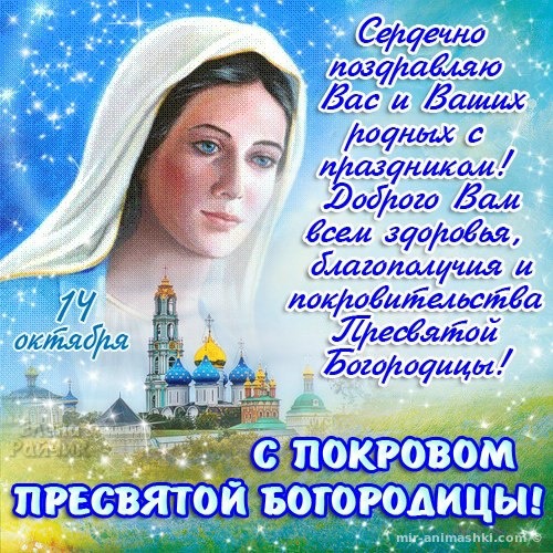 Великий праздник Русской Православной Церкви — Покров Пресвятой Богородицы и Приснодевы Марии празднуется ежегодно 14 октября по новому стилю (1 октября — по старому). Это главный осенний праздник, история которого восходит к 910 году, к периоду, когда Византийская империя вела войну с сарацинами. В этот день в Константинополе (к которому уже вплотную подошли мусульмане), во Влахернской церкви, где хранилась риза Богоматери, во время богослужения юродивый Андрей и его ученик Епифаний увидели парящую в воздухе Богородицу, которая распростерла над молящимися свое широкое белое покрывало — покров... В воскресный день, во время всенощного бдения, когда храм был переполнен молящимися, святой Андрей, Христа ради юродивый, в четвертом часу ночи, подняв очи к небу, увидел идущую по воздуху Пресвятую Владычицу нашу Богородицу, озаренную небесным светом и окруженную Ангелами и сонмом святых. Святой Креститель Господень Иоанн и святой апостол Иоанн Богослов сопровождали Царицу Небесную. Преклонив колена, Пресвятая Дева начала со слезами молиться за христиан и долгое время пребывала в молитве. Потом, подойдя к Престолу, продолжала Свою молитву, закончив которую, Она сняла со Своей головы покрывало и распростерла его над молящимися в храме людьми, защищая их от врагов видимых и невидимых. Пресвятая Владычица сияла небесной славой, а покров в руках Ее блистал «паче лучей солнечных». Святой Андрей с трепетом созерцал дивное видение и спросил стоявшего рядом с ним своего ученика, блаженного Епифания: «Видишь ли, брат, Царицу и Госпожу, молящуюся о всем мире?». Епифаний ответил: «Вижу, святый отче, и ужасаюсь».