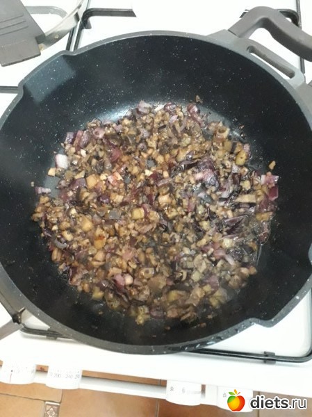 Все отрезанное-вычищенное мелко рубим(шкурку со шляпок я не рубила, выбросила, но вообще можно, если она была беленькая). Мелко нарезаем баклажаны и репчатый лук(его обжариваем до смешивания). Баклажанов должно быть примерно 50/50 с полученной смесью из грибов. Все смешиваем и жарим на сковороде 10 минут
