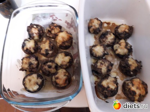 Укладываем в смазанную маслом(лучше сливочным, но я смазывала оливковым) форму, на дно добавляем чуть-чуть воды(кипяток), чтобы шляпки не пересохли. Ставим в разогретую до 180-200 градусов духовку примерно на 30 минут, готовность определяйте по подрумянившемуся верху.