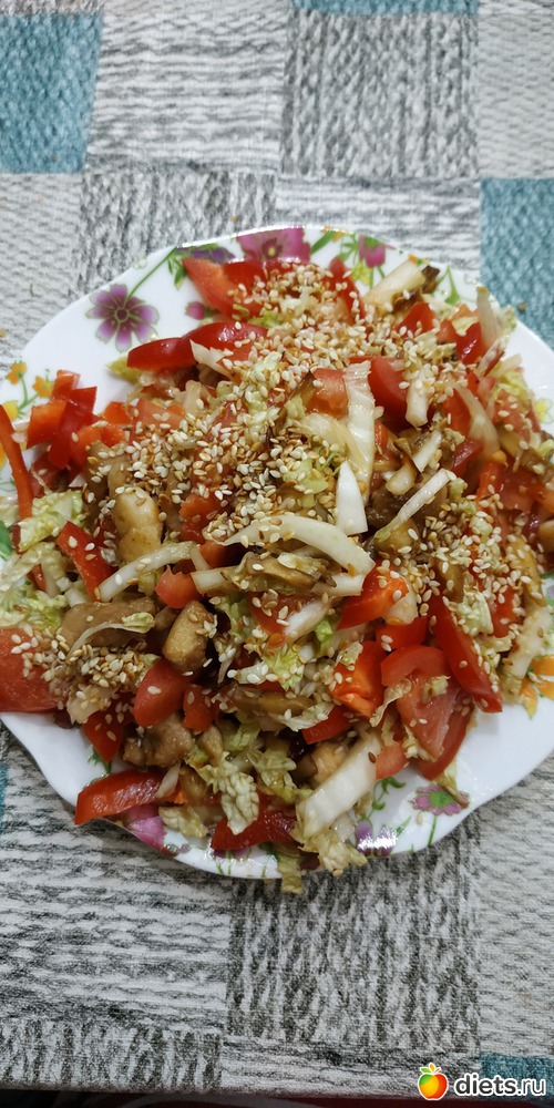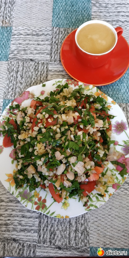 Курицу мелко режем обжариваем до готовности. В салат добавляем булгур и мясо все перемешиваем и наслаждаемся