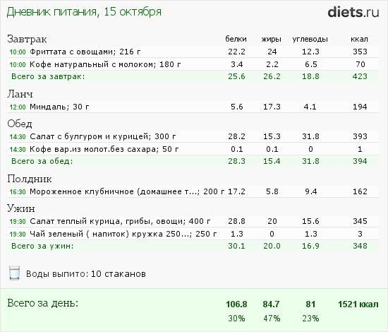 Чуть не забыла подитожить. Итак за десять дней итог в весе плюс 100 гр. Но снижения в весе и не обещали. Кто то худеет в эти 10 дней, кто то нет. Я вот нет. Теперь перехожу на ПП питание на 1500 тыс ккал. Должен же вес все таки двинуться. Взвешиваться буду раз в неделю по вторникам. Итак с марта сброшено всего 3 кг 100 гр. посмотрим как мой вес сдвинется после этой 10 дневной встряски.