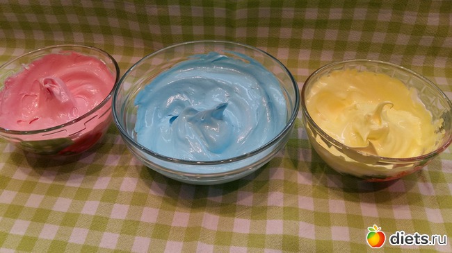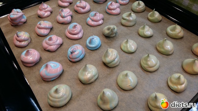 и отсаживаю безешки на застеленный пергаментом противень, можно безешки просто одного цвета делать, буду желтые, голубые и розовые