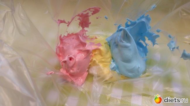 цветную белковую массу выкладываю в обычный полиэтиленовый пакетик, немного смешиваю, отрезаю уголок