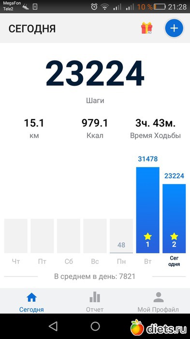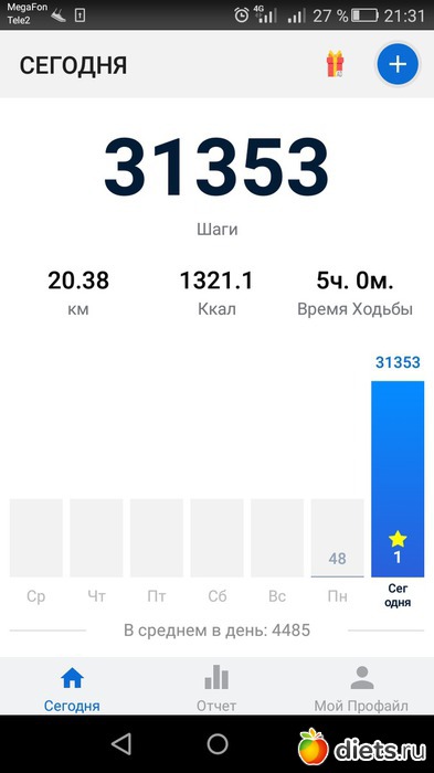 У меня в среднем около 15 тысяч за день. Стараюсь каждый день делать не меньше 10 тысяч.