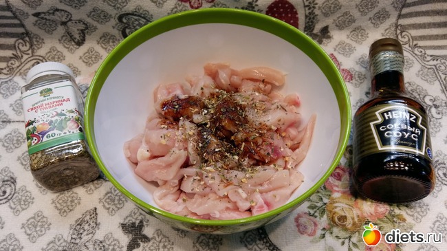 400 грамм грудки нарезаю соломкой, добавляю специи по вкусу, пару чайных ложек соевого соуса и столовую ложку масла растительного, перемешиваю
