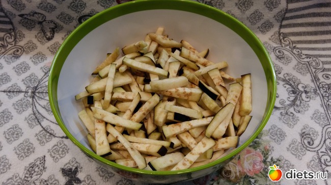а пока буду заниматься овощами, грамм 300 баклажанов нарезаю соломкой