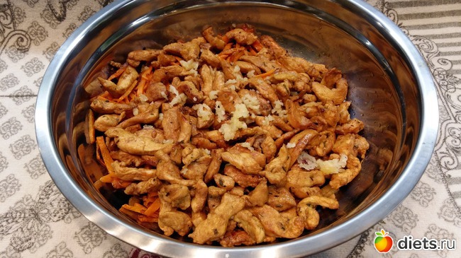 и в в последнюю очередь обжариваю курицу, так же ее выкладываю в миску, выдавливаю чеснок по вкусу, у меня один крупный зубчик