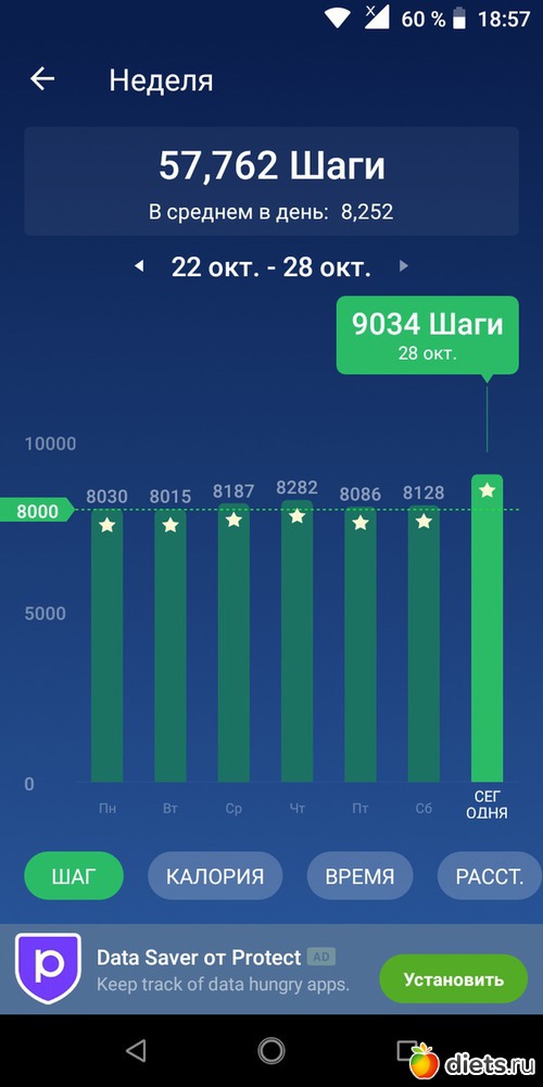Особенно тщательно на неделе я блюла норму в 8000 шагов, иногда выходила на прогулку в 22 -23 часа, чтобы успеть дошагать тысчонку-другую: