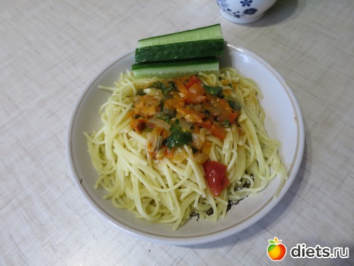 обед - спагетти с подливкой овощной + огурчик+ даже хлебушек,