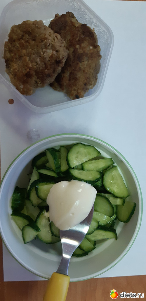 Обед:Котлетки (95гр), огурец (128гр) с домашней сметаной (16гр)