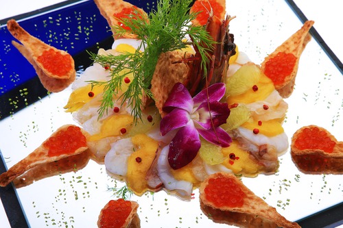 7. На вафельный хлеб «Елизавета» выложите, чередуя, морские гребешки и манго.
