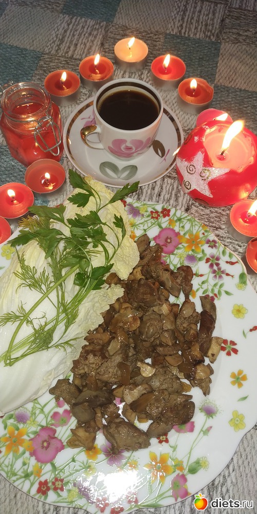 печень, шампиньоны жаренные с луком, пекинская капуста