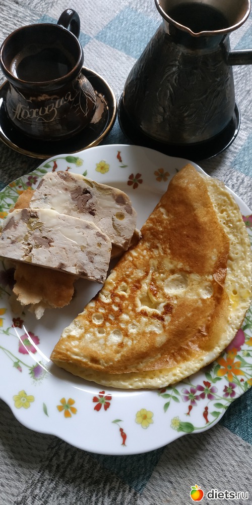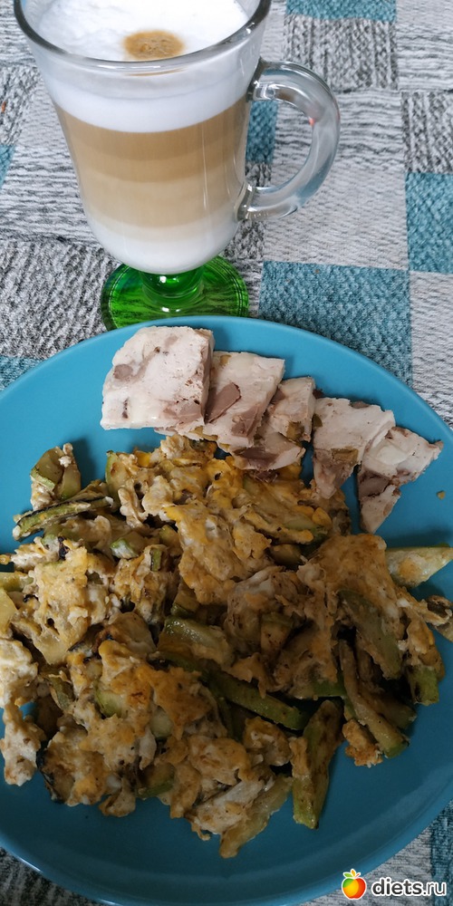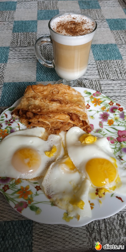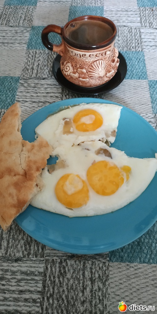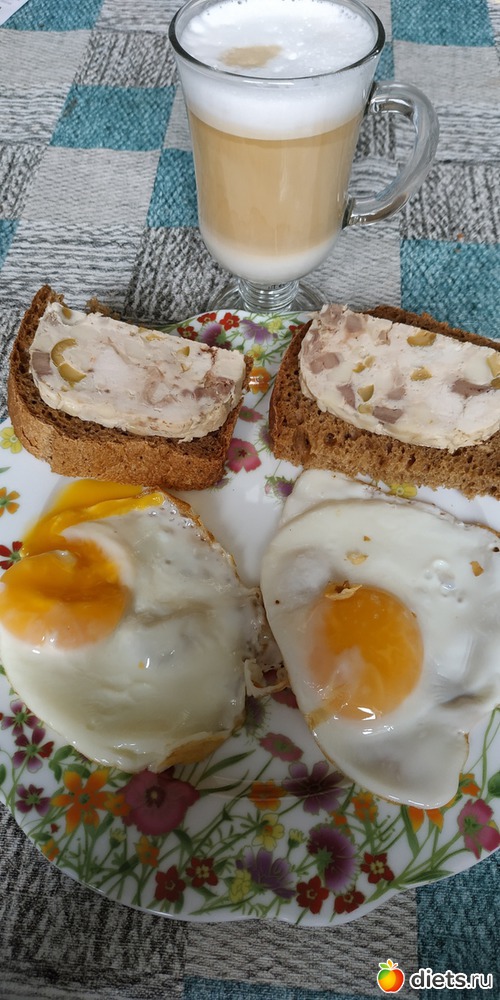 Глазунья, цельнозерновай хлеб с домашней колбаской (состав: куриная грудка, сердечки, оливки, сыр натура легкий, молоко, специи, чеснок)