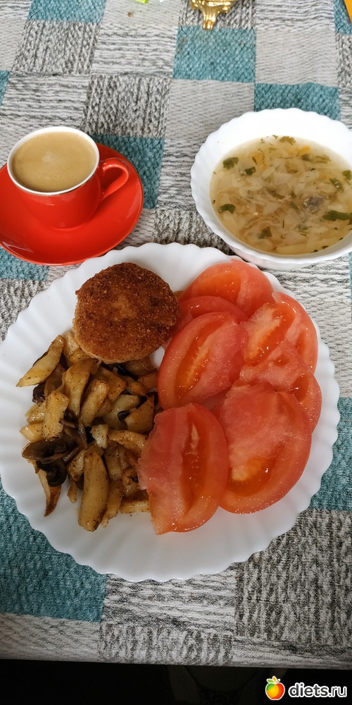 Щи, картошка с грибами, куриная котлета из грудки, свежие овощи