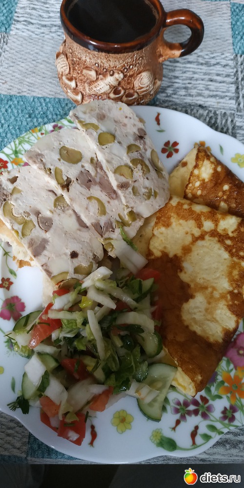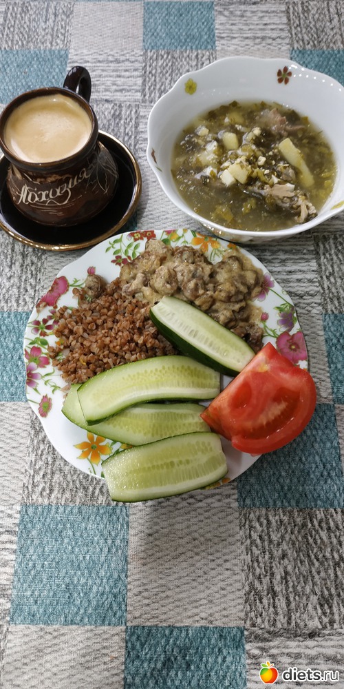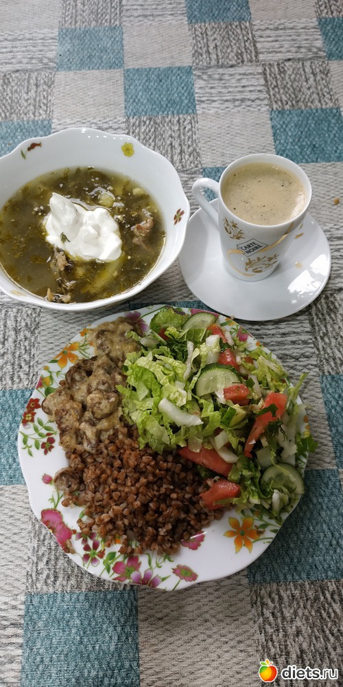 Зеленый борщ, гречка, сердечки жаренные в сливках, салат из свежих овощей)