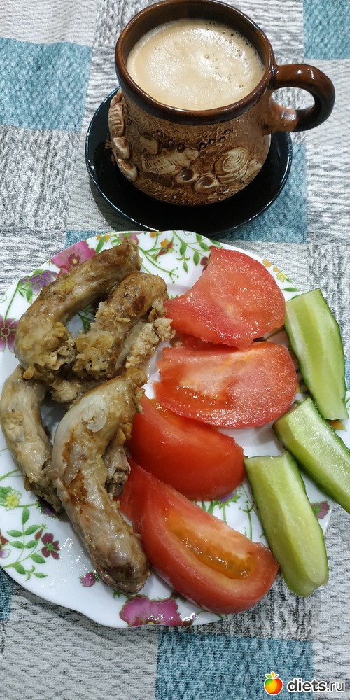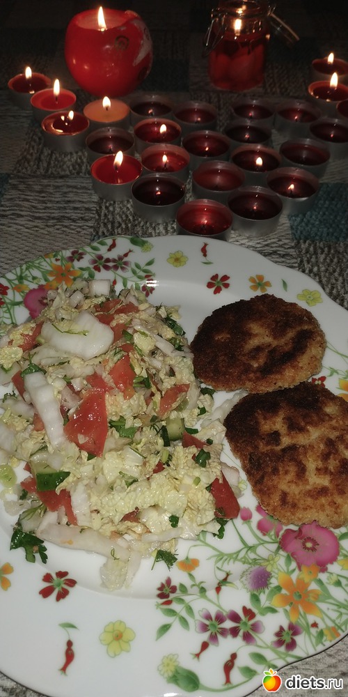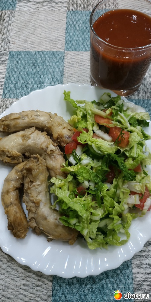 куриные котлеты (грудка), салат из свежих овощей, овощной сок