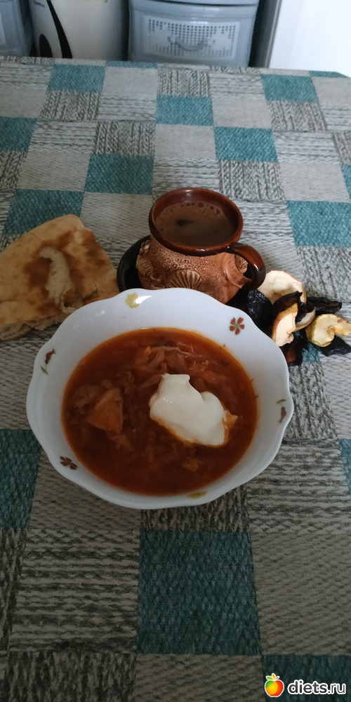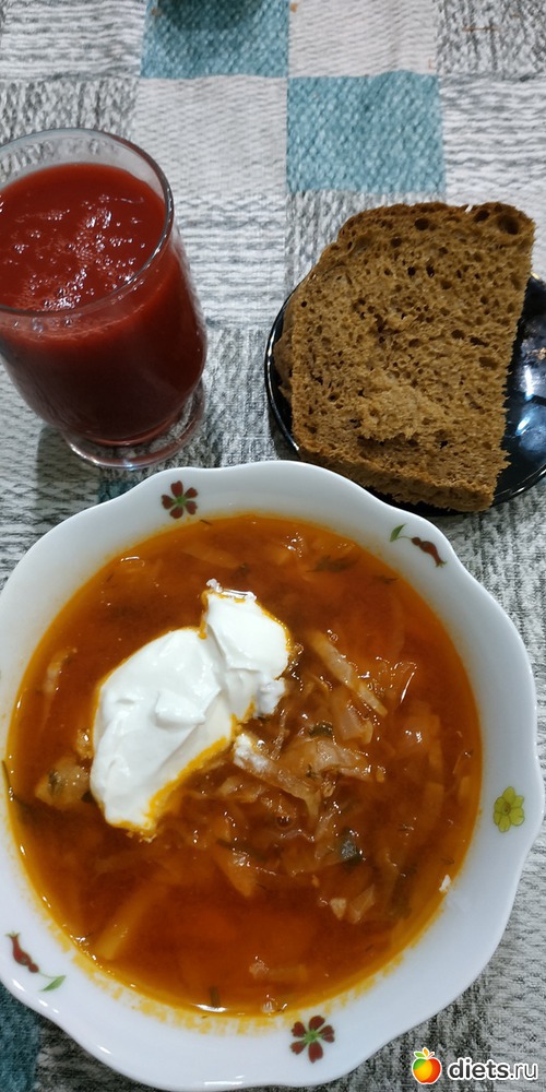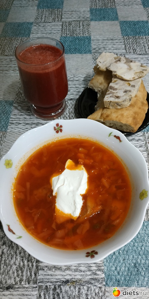 борщ, гречка, грудка с ананасами, свежие овощи, томатный сок